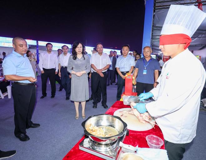 鸿熙居布袋鸡的工作人员表演的蒙眼剔鸡更是让人赞叹,只见工作人员蒙眼上阵,以超凡刀工在鸡脖处轻盈划开一寸小口,便如行云流水般将翅骨、腿骨乃至全身骨骼一一剔除,而整鸡外壳竟完好无损。更神奇的是,这剔骨后的鸡身空壳,竟能灌水而滴水不漏,引得现场消费者纷纷驻足围观,无不赞叹这精湛绝伦的厨艺风采!
